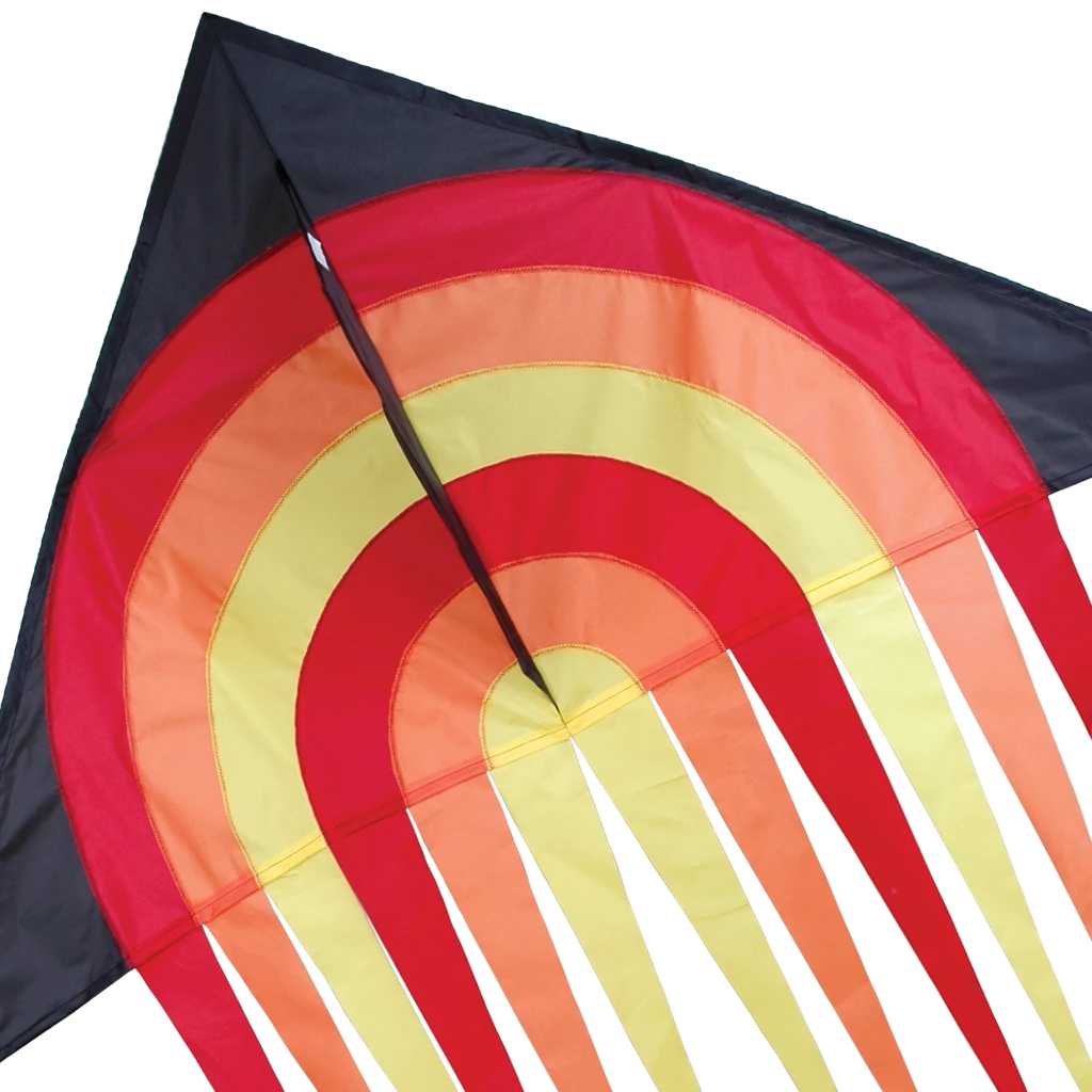 Expert kite builders know that adding fringes or tails to the trailing edge of a delta kites improve the stability of this very popular platform. The Premier 56 in. Streamer Delta has an impressive wind range, making it an excellent choice for either inland or beach flying. The classic retro graphics look great in the sky with the beautiful streams dancing in the wind. Put your rainbow to the sky!